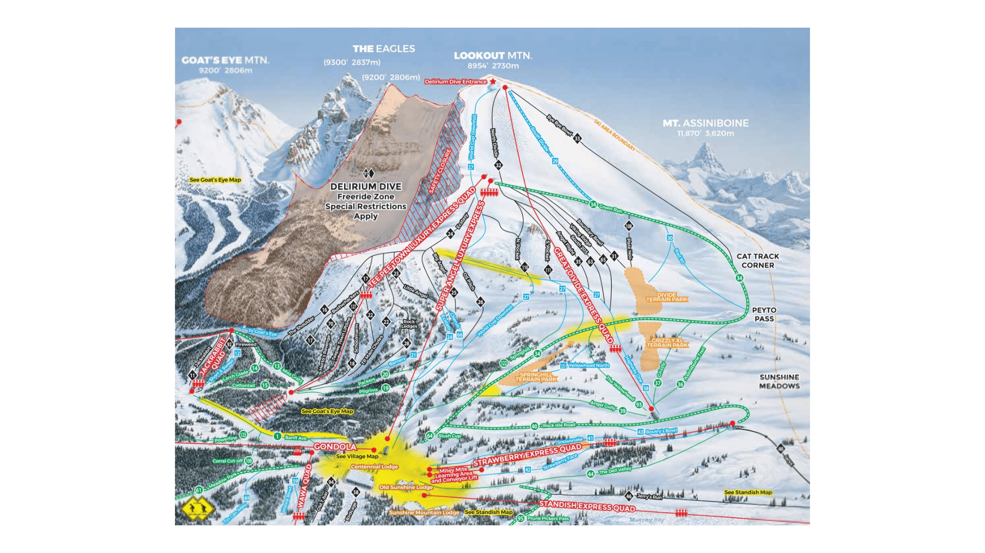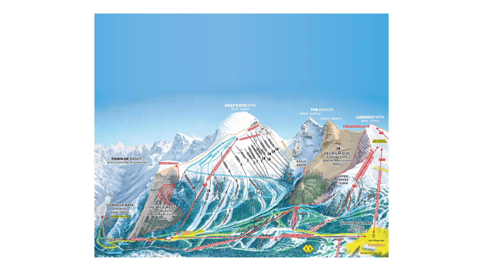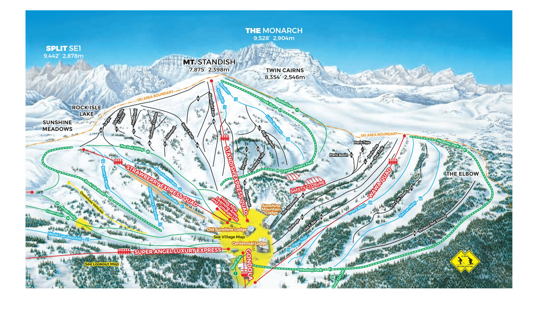 The Banff ski map and resort, offered referred to as Sunshine Village or simply Sunshine, is one of Canada’s most scenic and snow-reliable alpine resorts. Located in Banff National Park, Alberta, high in the Canadian Rockies. Renowned for its long season, spectacular alpine views, and wide-open terrain.