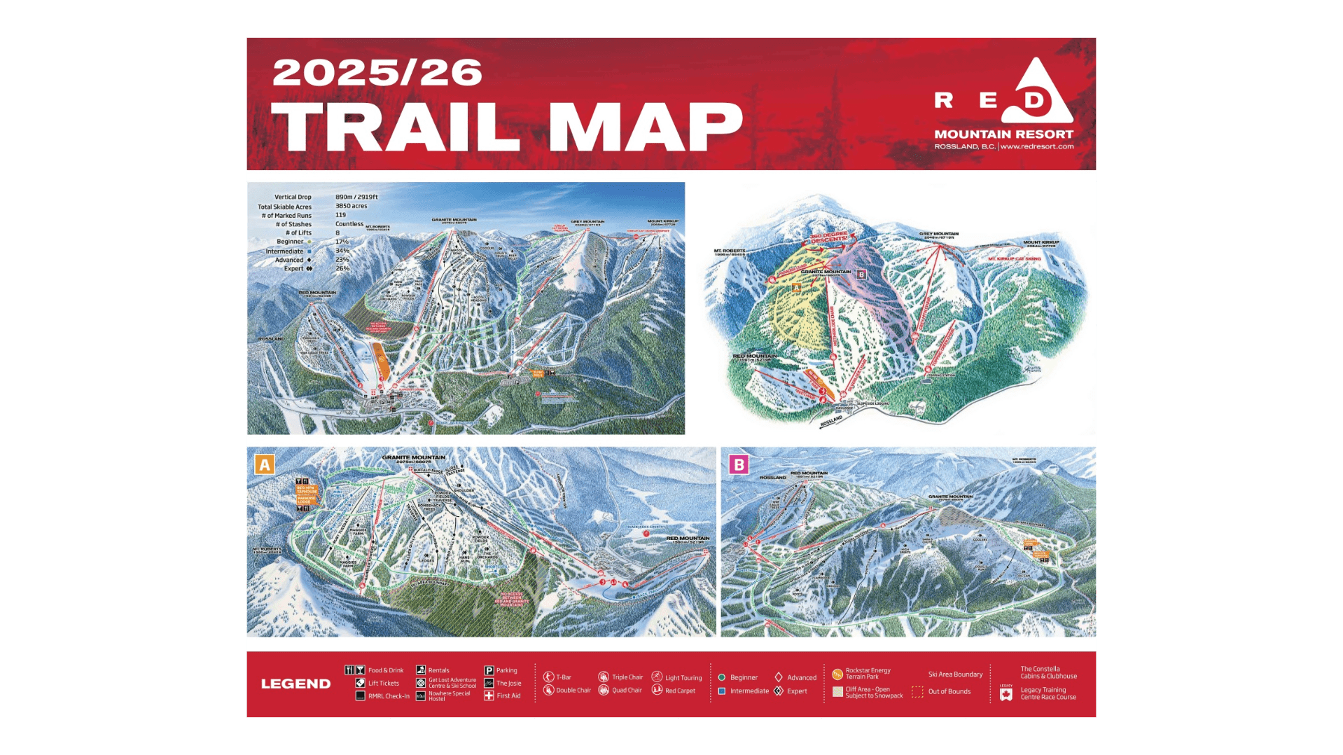 The Red Mountain ski map and resort is one of Canada’s classic alpine destinations. Located near Rossland, British Columbia, in the Monashee Mountains just north of the U.S. border. Renowned for its old-school character, deep powder snow, and extensive terrain that has a big draw to intermediate and expert skiers and snowboarders.