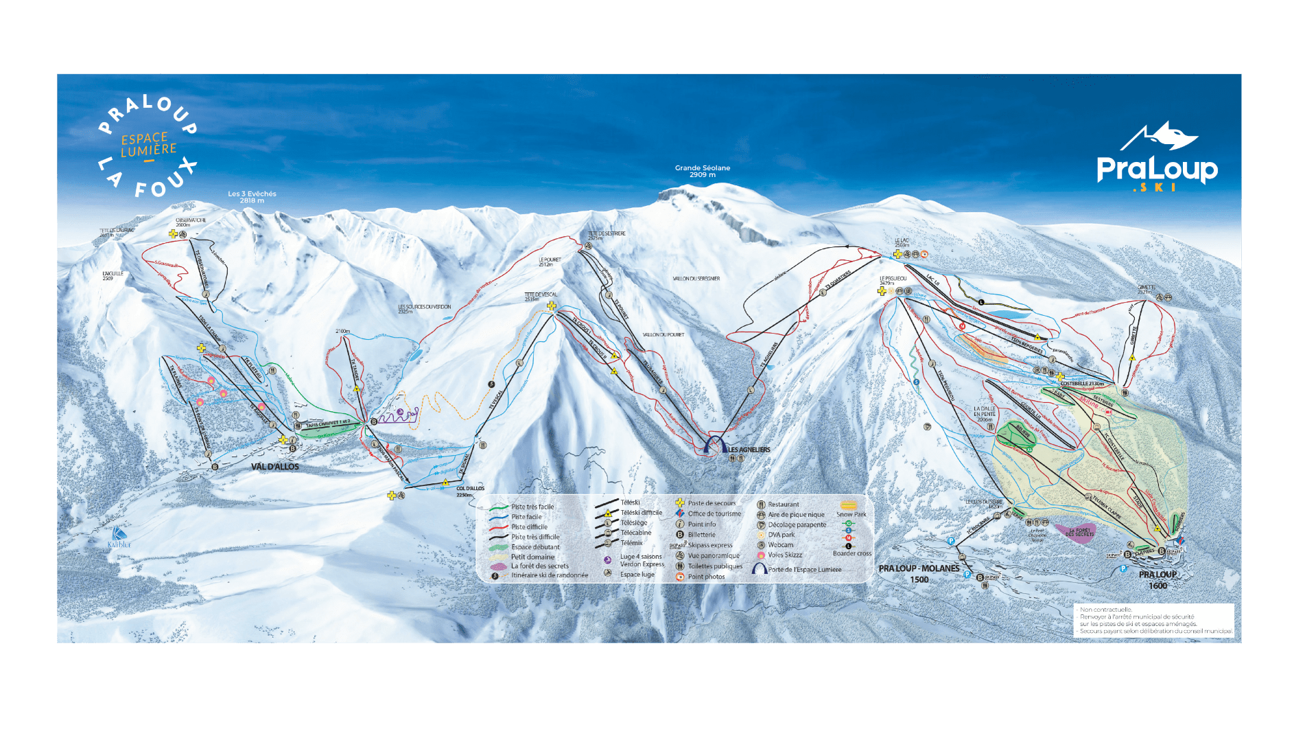Espace Lumière ski map and area is located in the Alpes-de-Haute-Provence region of south eastern France. A large and sunny ski area that links the Pra Loup and Val d’Allos resorts. Known for its mountain scenery, extensive slopes, family-friendly atmosphere and relatively close to Nice.