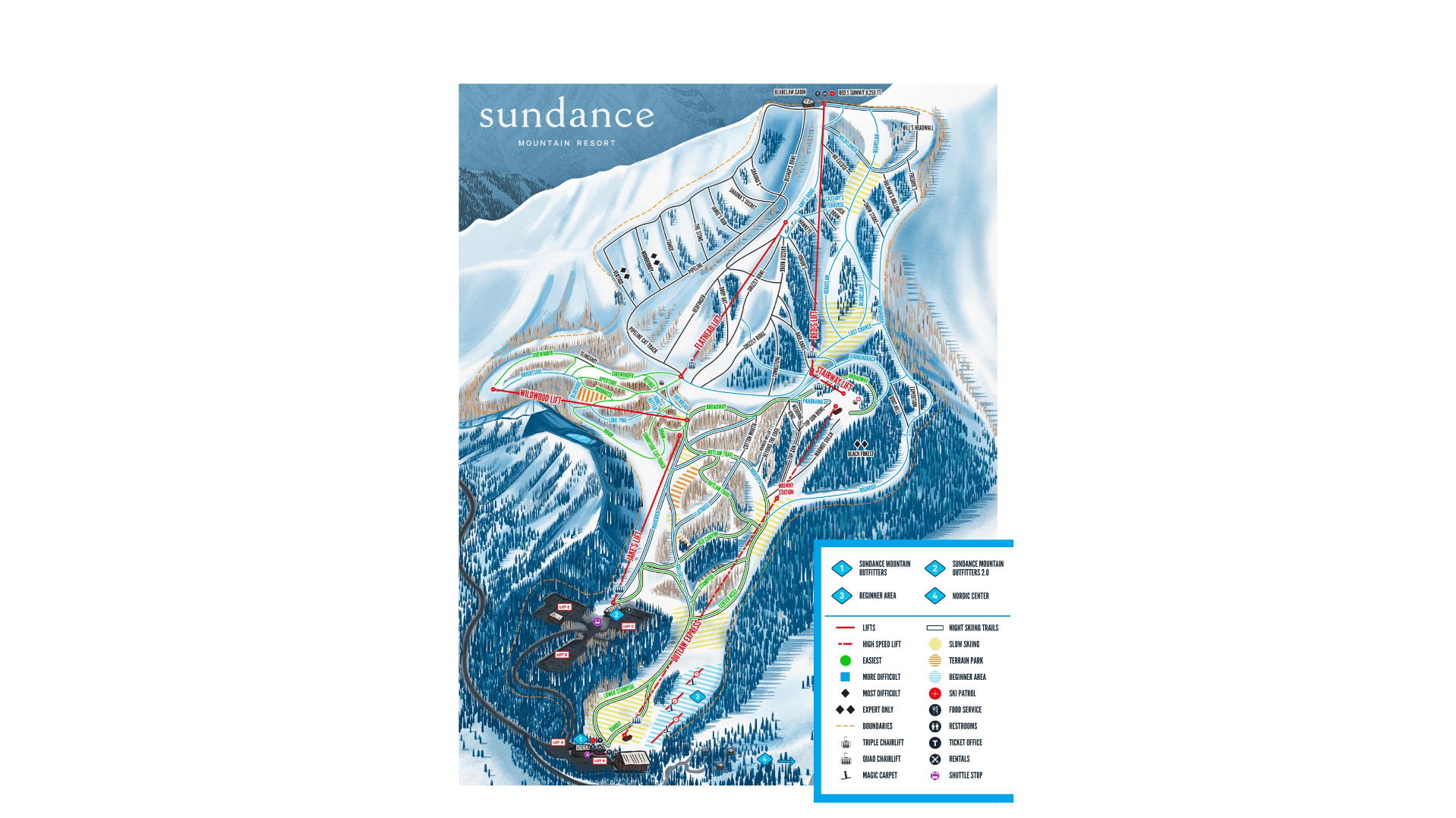 The Sundance resort map has something available for everyone. Green, blue and a variety of advanced black runs. Additionally, Sundance offers night skiing on selected nights. Lastly, modern infrastructure with multiple chairlifts, including high speed lifts.